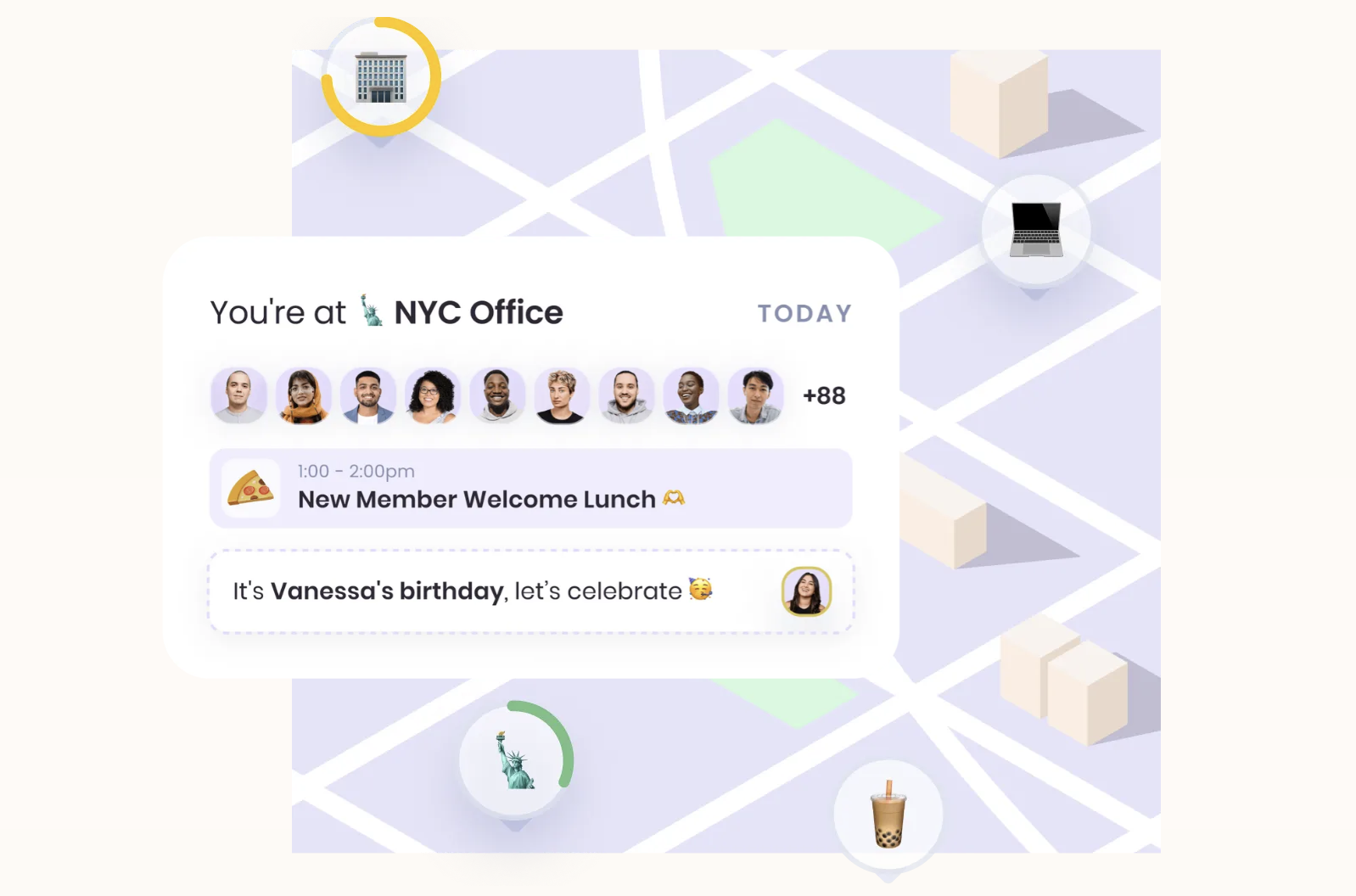 - Slack & Microsoft Teams integration: set locations, view teammates' statuses based on calendars (meetings, office hours, birthdays) and see where team and work besties are working from.